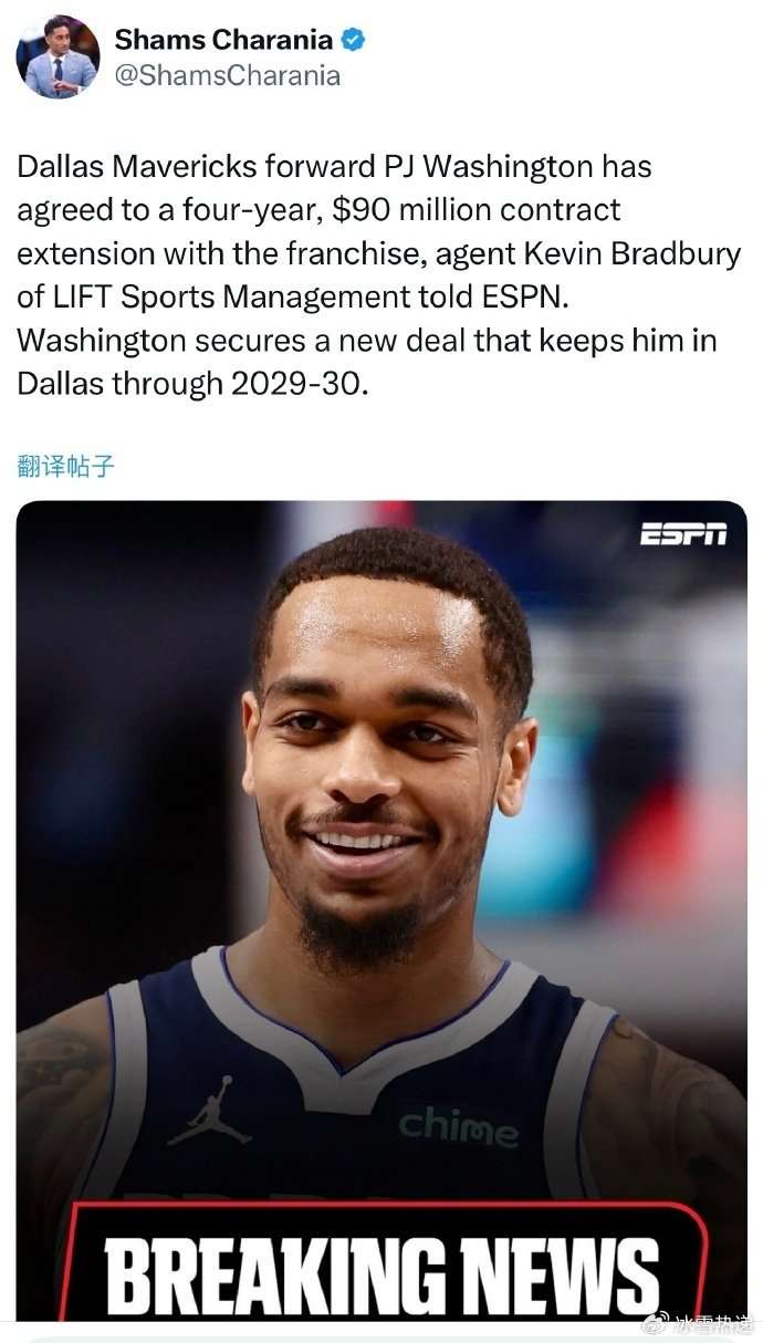 4年9000万!独行侠官宣提前续约华盛顿 将有6个月交易限制期